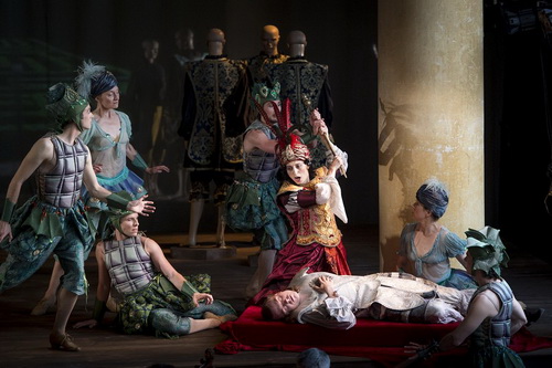 Abgesehen von Francesco Vitalis prächtigen Barockkostümen, kommt Armide, das Liebesdrama zwischen der Zauberin Armide und dem Kreuzritter Renaud, ohne Ausstattungspomp aus. Nur die wechselnden Prospekte im Hintergrund deuten Unterwelt oder Zaubergarten an, darüber hinaus werden die Seitenbalustraden und der Gehweg vor den Parkanlagen ins Spiel mit einbezogen. Die Inszenierung von Deda Christina Colonna verbindet moderne psychologische Personenführung mit historisch fundierten Tanzeinlagen – furios dargeboten von den Nordic Baroque Dancers – die, ein Markenzeichen der höfischen Oper, in die Handlung integriert sind.