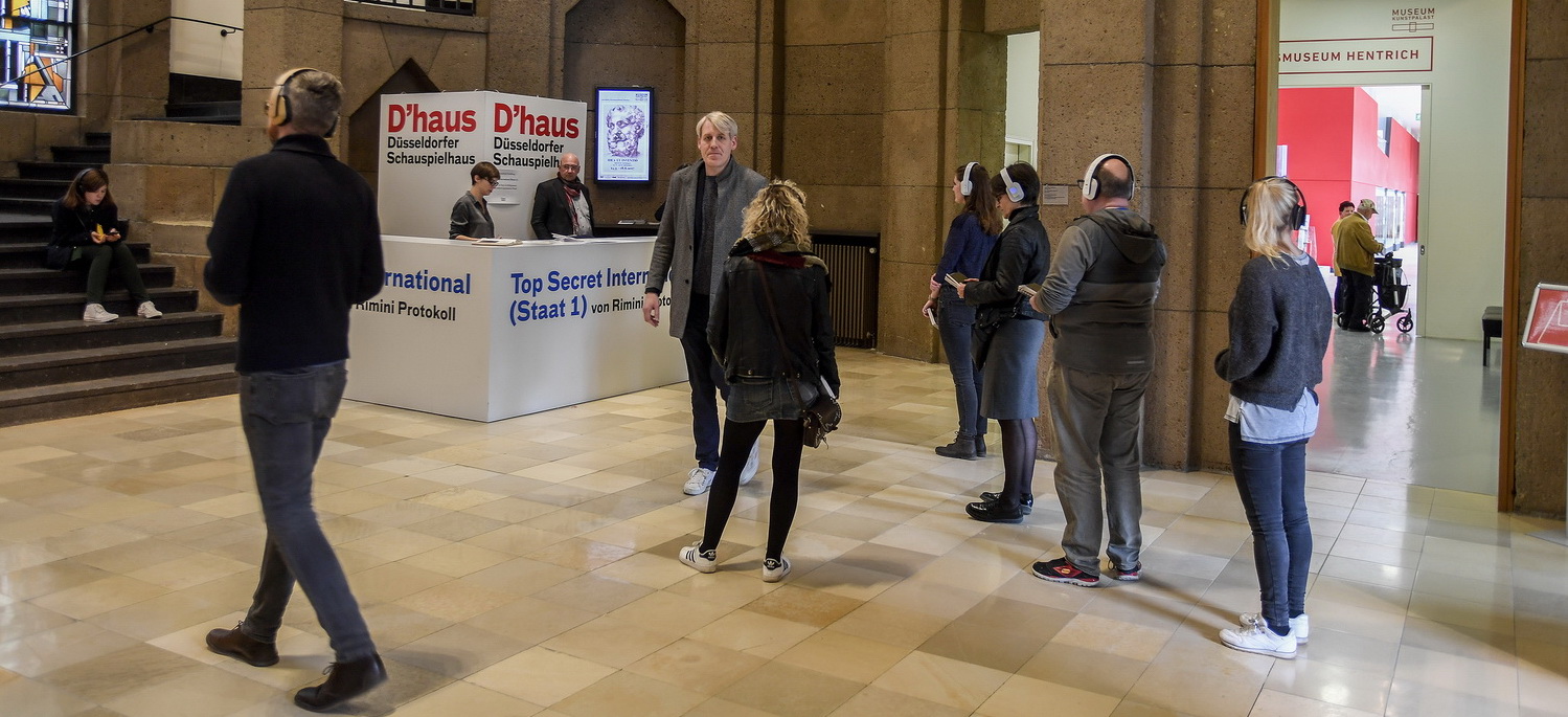 Die erste Produktion Top Secret Inter­na­tional (Staat 1) kam im Dezember vergan­genen Jahres in den Münchner Kammer­spielen zur Urauf­führung. Einen Monat später wurde das Stück in New York durch­ge­führt. Am 8. Juni wird es dann im Düssel­dorfer Museum Kunst­palast zu erleben sein. Eine Bühne im Kunst­palast? Beileibe nicht. Rimini Protokoll hat sich von der Bühne verab­schiedet. Und das durchaus nicht aus ideolo­gi­schen, sondern ganz prakti­schen Erwägungen. Wer sich über Spionage, Spiona­ge­abwehr oder einfacher: infor­melle Kommu­ni­kation Gedanken machen und dazu Zeitzeugen einladen will, wird im öffent­lichen Raum kaum Erfolg haben. Spione und Agenten gehen nicht an die Rampe, um zu erklären, wie sie arbeiten. „Spione gehen ja auch nicht in Museen, weil die viel zu sehr überwacht werden. Auch wenn das Kino anderes sugge­riert“, erzählt Jessica Paez, die das Projekt seitens des HKW betreut. „Die Alter­native wäre ein Hörspiel gewesen, aber das war den Künstlern zu langweilig“, sagt Paez. Warum das Museum dennoch ein idealer Ort für diese Veran­staltung ist, muss jeder Besucher für sich selbst herausfinden.