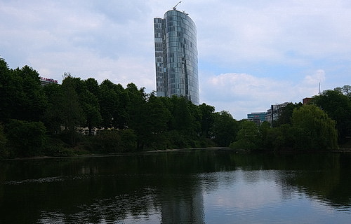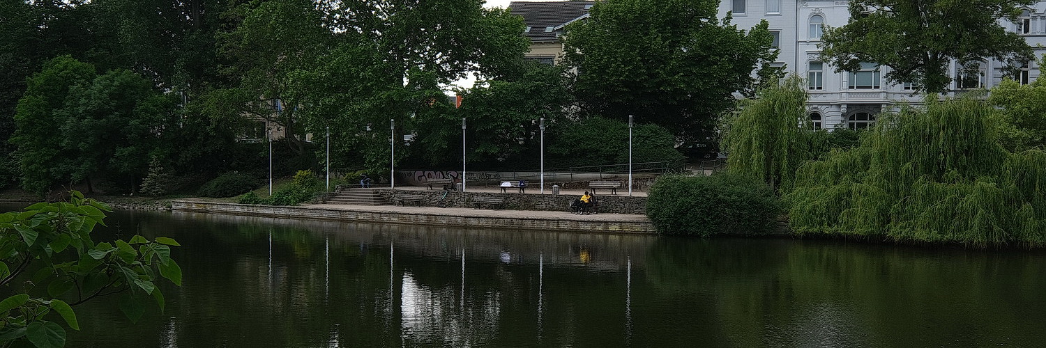Die Idee ist auf den ersten Blick bestechend. Der Schwanenspiegel ist Teil des Ständehausparks. Neben dem Kaiserteich einer von zwei Teichen, die 1804 im Außenbereich des damaligen Stadtkerns angelegt wurden, und die miteinander verbunden sind. Dort gab es immer wieder Cafés und auch einen ehemaligen Bootsverleih, der an der Westseite des Gewässers angelegt war. Dort erinnert heute nur noch eine ruhig gelegene, zweistufige Terrasse an die einstige Betriebsamkeit. Davor breitet sich eine stille, güllegeschwängerte Wasserfläche aus. Im Hintergrund ragt das „Gap 15“, ein Hochhaus, das die Prosperität der Stadt verkörpert, in den Himmel.