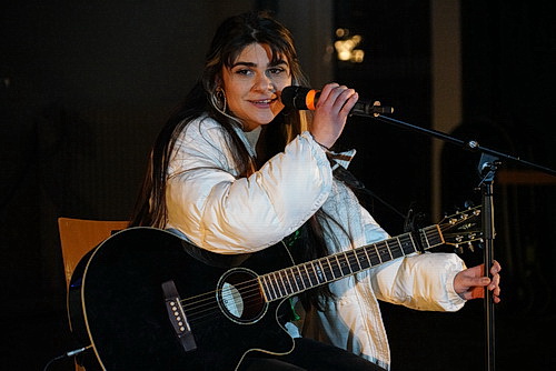 Dass es enge Verknüpfungen gibt, wird spätestens deutlich, wenn als nächstes Helya ebenfalls mit Gitarre auftritt. Sie ist die Tochter von Katsaviara. Mit ihren eigenen Kompositionen Puppet Show und Sun and Moon Shine erzielt sie einen achtbaren Erfolg. Warum noch ein Cover folgen muss, erschließt sich nicht ganz, aber geschenkt. Ein bisschen weniger laissez-faire, ein bisschen mehr Engagement für ihre Texte und eine Spur mehr Vertrauen in ihren Körper, den sie nicht auf einem Stuhl zusammenknicken muss, dann kann da noch ganz viel passieren. Jedenfalls vielversprechend, was sie dem Publikum zu Gehör bringt. Für den Abschluss des kleinen Konzertteils ist Konstantinos Angelopoulos zuständig, ein Liedermacher aus Athen, der es in Griechenland schon zu einiger Bekanntheit gebracht hat. An diesem Abend verlässt er sich auf Cover-Versionen. Mit Und wenn deine Augen, Erinnerungen des Wassers und Freelove, letzteres von Depeche Mode, sorgt er für ein fröhliches Finale, nach dem er alle Beteiligten noch einmal auf die Bühne ruft. Der Applaus währt lange. Es hätte noch eine rauschende Party werden können, aber da ist die Hausordnung des Gymnasiums vor. Was zu der Frage führt, warum der Abend nicht ohnehin besser im Studio des Theaters der Klänge aufgehoben gewesen wäre. Das hätte zwar an der verheerenden Parkplatzsituation nicht viel ändern können, aber vielleicht noch ein Quäntchen mehr Atmosphäre zaubern können.