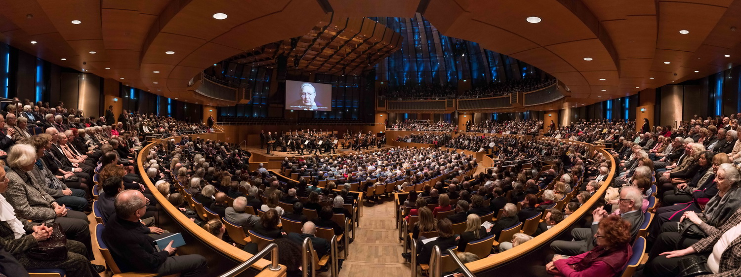 Auf der Videoleinwand, die über den Köpfen des Orchesters in der fast vollständig ausverkauften Düsseldorfer Tonhalle aufgehängt ist, ist das Konterfei eines alten Mannes zu sehen. Stümperhaft ist seine kurze Ansprache zusammengeschnitten, mit der er sich für den Erhalt eines Preises bedankt, den er offenbar nicht kennt, von jemandem, den er ganz offensichtlich nicht kennt.