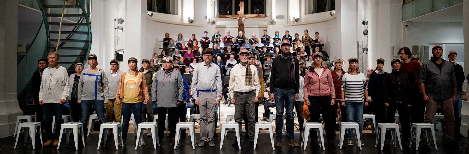 Inzwischen laufen die Proben für die Uraufführung am 5. November auf Hochtouren. Denn Abendroth denkt groß. Als Fundament des Chorwerkes dient das 30-köpfige Düsseldorf-Festival-Orchester, in dem Flötistin Oxenfort ebenfalls vertreten ist. Der Düsseldorfer Kammerchor und die Johanneskantorei Düsseldorf vermischen sich zu einem Haupt- und einem Spielchor. Die Akademie für Chor und Musiktheater an der Johanneskirche stellt den Kinderchor unter Leitung von Justine Wanat. Und für die nötige Bewegung sorgt Choreograf Takao Baba mit vier jungen Tänzern der Jugendkompagnie des Tanzhauses NRW, denen sich der Kinderchor anschließen wird. Wer die Johanneskirche kennt, weiß, dass sie vor allem eines nur in begrenzter Menge zur Verfügung hat, und das ist Platz. Angesichts allein der Personenzahl eine besondere Herausforderung für Regisseurin Nicola Glück, die hier bereits Nabucco von Giuseppe Verdi und Gustav Holsts Savitri inszeniert hat. „Ich nehme die Kirche als den Kirchenraum, der er ist – natürlich bauen wir einen Sockel und ein Podest rein, damit man was sehen kann – aber ich finde es wichtig, dass die Kirche als Kirche zu erkennen ist. Sie wird nicht zum Theaterraum verzaubert“, erklärt Glück ihren Ansatz. Und so hat sie vor Chor und Orchester nur noch eine kleine Spielfläche zur Verfügung, auf der sich Spielchor, Jugendliche und Solisten tummeln. Die Solisten hat Abendroth klassisch besetzt und eine großartige Besetzung gefunden. Sopranistin Theresa Nelles ist ebenso wieder dabei wie die Altistin Franziska Orendi. Als Tenor tritt Christian Sturm auf und als Bass der Mensch, der gerade an allen Bühnen, nicht nur in Düsseldorf, nachgefragt wird: Tomas Kildišius. Allein die Kostproben, die an diesem Abend zu hören sind, machen einen Besuch der Uraufführung dringend empfehlenswert. Denn Abendroth hat seinen Sängern die Stimmen auf den Leib geschrieben. Da kann Nelles ganz entspannt glänzen, Orendi verleiht dem Raum einen besonderen Klang, Sturm sorgt für Dramatik, ohne allzu sehr in die Höhen getrieben zu werden, und Kildišius klagt der Welt sein Leid. Das klingt an diesem Abend mehr als vielversprechend. Und das Ergebnis könnte sich noch steigern, denn Abendroth feilt noch intensiv daran, die Energien zu bündeln und die Stimmen feinzuschleifen. Da wird das Tempo reguliert, ein Vibrato gestrichen und der Einsatz besser eingepasst. Währenddessen läuft ein Außenbeobachter mit Partitur durch die Kirche, kontrolliert von allen Seiten die Klangwirkung.