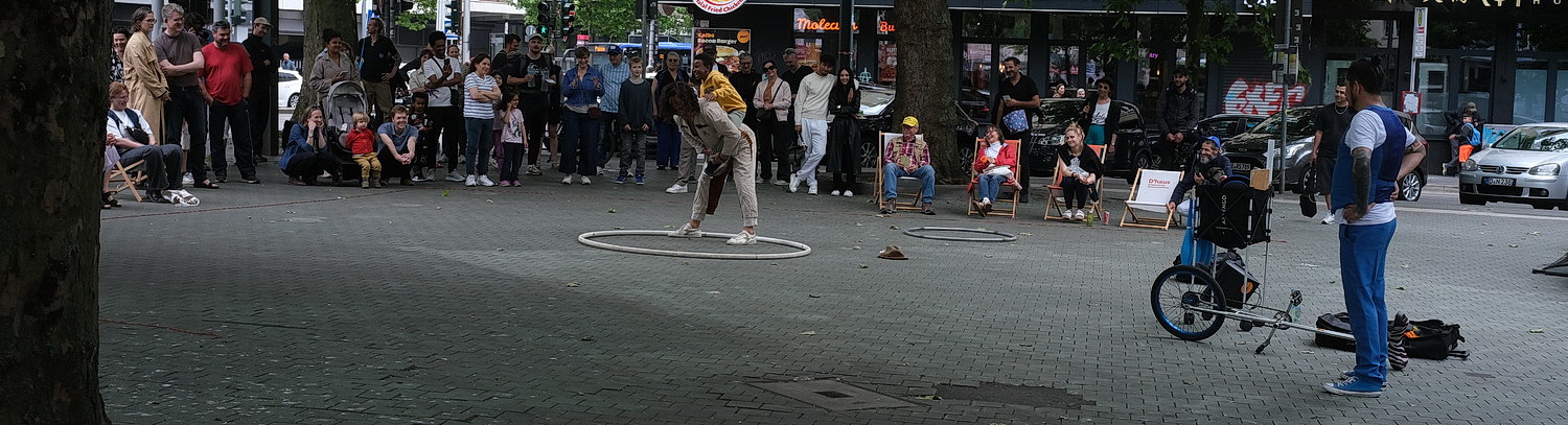 Dass am Sonntag zeitgleich ein Straßenfest stattfindet, das sich auf dem Worringer Platz abspielen soll, lockt dann abschließend auf den Platz, wo ein Artist mit einem Kind und Ringen die Zuschauer in seinen Bann zieht. Ein letzter Blick auf das Postämtchen und den Aktionsraum D, wo in den letzten beiden Tagen ebenfalls Aufführungen stattfanden, dann geht es mit dem Fahrrad wieder nach Hause.