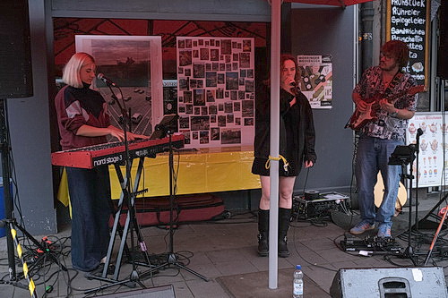 Für das Eiscafé Stefan erweist sich das Festival als absoluter Gewinn. Ohnehin durchweg gut besucht, ist die Terrasse überdurchschnittlich gefüllt. Hier treten Steve Savage an der Gitarre und Eric Koslosky am Bass auf. Gefällige Musik, professionell vorgetragen, während Besuchergruppen vorüberziehen, darunter geführte Gruppen, die erfahren, wann welche Läden geschlossen wurden, im nebenan liegenden House of Friends, das ehemalige Hotel, das seine verrückt eingerichteten Zimmer längst nicht mehr vermietet, ein ständiges Kommen und Gehen, im Fenster die Ausstellung zweiter Fotos: Das bunte Umfeld sorgt für so etwas wie Urlaubsgefühl in der eigenen Stadt. Das erlebt man nicht so oft in Düsseldorf. Wunderbar. Da bleibt man gern noch ein wenig sitzen, um sich wenigstens die ersten Takte von Ruka anzuhören. Laura Rukavina beendet gerade ihr Studium an der Robert-Schumann-Hochschule in Düsseldorf und versucht sich nun im Auftritt mit einer Band. Die „akustische Besetzung“ erweist sich als E‑Gitarre und Keyboard. Die Texte sind nicht verständlich, also geht es weiter. Das Privileg des Festivals. Du gehst einfach weiter. Vorbei am Balkan World, wo einige Lesungen am Wochenende stattgefunden haben, die allerdings in der Vorankündigung so klangen, als sollte hier mehr belehrt als unterhalten werden. Im WP8, dem Künstlerverein, erklingen Kinderlieder. Im Freibad, der neuen Spielstätte am Worringer Platz 8, toben sich Kinder mit aus Schaumstoff geschnitzten Skulpturen aus.