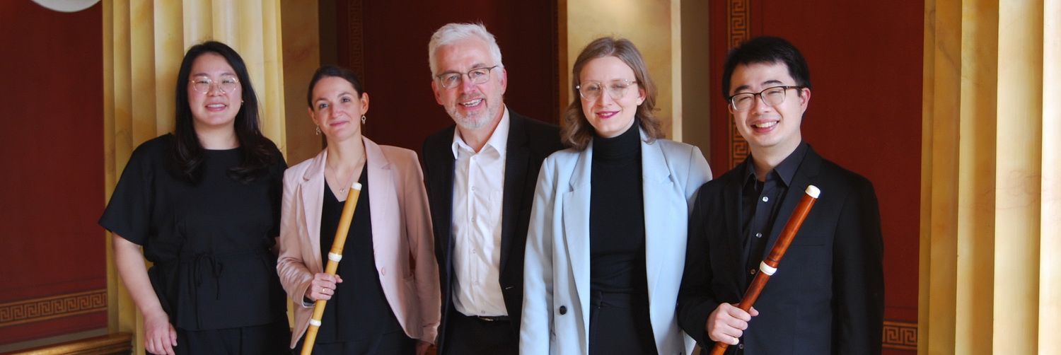 Bei strahlendem Sonnenschein und den ersten sprießenden Frühlingsblumen auf dem Wilhelmsplatz war das Geburtstagskonzert fast eine Einladung zur zeitgleich stattfindenden Bundestagswahl. Die jungen Musiker Ching-Yao Wang und Elisabeth Haberl an der Flöte, Maria Danneberg an der Viola da Gamba und Sobin Jo am Cembalo stammen aus Österreich, Taiwan und Korea und haben sich in Wien zusammengetan. Das Programm der Matinee war spannend zusammengestellt und ließ teilweise das ganze Ensemble und manchmal nur die zwei Flöten oder das Cembalo erklingen. Beeindruckend dabei vor allem ein Stück des Bach-Sohns Wilhelm Friedemann, das den beiden Flötisten die Gelegenheit bot, sich im virtuosen Spiel quasi die Bälle zuzuwerfen und durch ihre stimmliche Brillanz zu glänzen. Sehr gut gewählt waren auch die dominierenden Triosonaten, bei denen die beiden von den Flöten getragenen Oberstimmen mit der Viola da Gamba als Bassstimme und dem begleitenden Cembalo zu hören waren. Die verwendeten Traversflöten waren Nachbauten aus der Entstehungszeit der Musik. Klanglich beeindruckten die Flötisten mit angenehm weichem Klang, der die Alte Aula der Universität erfüllte und mit der Gamba und dem Cembalo als Continuo-Instrumenten harmonierte. Händels g‑Moll-Sonate und die Cembalo-Suite Nr. 3 d‑Moll boten auch Danneberg und Jo die Möglichkeit, ihre Virtuosität zu zeigen. Man darf sich auf das Konzert im Mai freuen.