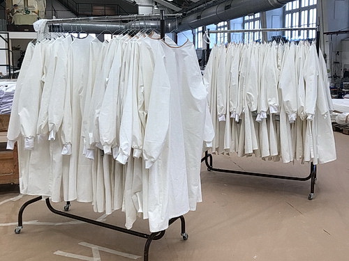 Für die Damen und Herren der Schnei­derei war es keine Frage, ob sie dem Mangel an Schutz­kleidung abhelfen können. Sie seien froh, in der jetzigen Situation einen sinnvollen Beitrag leisten zu können. Für die Fachleute war es auch kein Problem, sich auf die neuen Gegeben­heiten umzustellen.  Die Muster für Kittel und Maske wurden nach Origi­nal­vor­bildern und in Zusam­men­arbeit mit dem Arbeits­me­di­zi­ni­schen Dienst in Leipzig, der Univer­si­täts­klinik und dem Klinikum St. Georg erarbeitet. Das Material ist kochfeste Baumwolle, so dass Masken und Kittel mehrfach verwendet werden können. Vor ihrem Einsatz werden sie zentral gewaschen, steri­li­siert und gebügelt. Derzeit werden pro Woche etwa 10.000 Masken und 700 Kittel gefertigt. Es sind zwar keine zerti­fi­zierten medizi­ni­schen Schutz­masken, aber sie können sinnvoll in vielen Bereichen, wie in der Brand­di­rektion, im Gesund­heitsamt, im Ordnungsamt und den sozialen Diensten, aber auch in Kliniken und Einrich­tungen der Pflege und Betreuung einge­setzt werden.