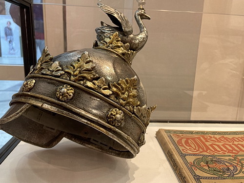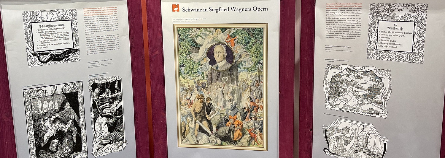 Der Schwan spielt bei Richard Wagner nicht nur im Lohengrin eine wichtige Rolle, sondern an überraschend vielen Stellen seines Gesamtwerks. Wenig bekannt ist, dass Wagner am Beginn seiner Exilzeit eine zweite Schwanenoper konzipierte: Wieland der Schmied. Die mächtigen Schwingen des Vogels fungieren darin als Symbol für die ersehnte revolutionäre Freiheit. Eine ganz andere Rolle spielt das Tier in Wagners letztem Musikdrama Parsifal. Der naive Tor erlegt dort in seiner unwissenden Arglosigkeit mit dem Pfeil einen Schwan und erschüttert damit die Gralsritterschaft in ihren Grundfesten. Wagner hat mit dieser Episode seine vom Buddhismus inspirierten Vorstellungen von Tierwohl auf die Bühne gebracht, für die er sich auch publizistisch engagierte. Manche Bezüge erschließen sich erst bei einem genaueren Blick in die Mythologie. Dabei lässt sich entdecken, dass auch die Walküren, die Rheintöchter und die Nornen einiges mit Schwänen zu tun haben und warum den Bayreuther Walküren früher sogar Schwanenhelme aufgesetzt wurden. Ein derartiger Bühnenhelm ist in der Ausstellung auch zu bewundern.