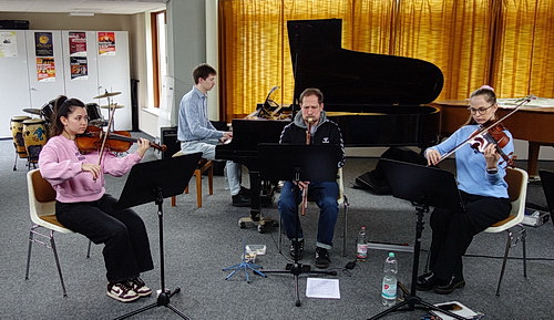 Es herrscht konzentrierte Stille in einem Probenraum der Scharoun-Schule, diesem vom Berliner Star-Architekten realisierten, außergewöhnlichen Lernort. André Meisner bläst die Backen auf, denn seine Duduk, das traditionelle armenische Holzblasinstrument, erfordert eine solide Luftsäule, um seine beschwörenden, langgezogenen Töne zu entfalten. Doch der Duisburger ist in diesem neuen Werk kein herausgehobener Virtuose, sondern agiert auf Augenhöhe mit einem Kammerensemble aus Streichquartett und Klavier. Denn die meditativen Klänge der Duduk sind Teil eines größeren Ganzen, das sich in mehreren der zwölf Stücke von Voyagers in den fließenden Bewegungen von bis zu zwölf Tänzerinnen fortsetzt.