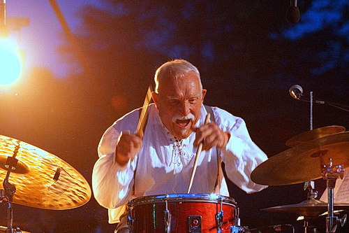 „This it not a jazzfestival“ lautete im letzten Jahr das Motto. Aber ist das wirklich so? Vielleicht entsteht Jazz, verstanden als universelle Haltung von Improvisation und kultureller Toleranz gerade dann, wenn das Wort mit den vier Buchstaben als einengende Schablone wegfällt. Weil sich dann die Dinge wieder aneinander reiben können. Vor allem gibt der feierfreudige soziale Kosmos einer Open-Air-Bühne zur blauen Stunde der Musik viel Luft zum Atmen. Günther „Baby“ Sommers Brother- and Systerhood klingt genauso, wie das neue Projekt heißt. Der aus Dresden stammende Schlagzeuger ist mit fast 80 Jahren ein unermüdlicher Ideengeber und Menschenfänger. Hier skandiert er, als sei es ein Rap, die Lautpoesie des Dadaisten Hugo Ball, die einem seiner aktuellen Stücke mit dem Titel Karawane zu Grunde liegt. Das gute Dutzend Musiker, die einen Querschnitt der deutschen Jazzszene ausmachen, und ebenso ihr Publikum steigen in all das und noch viel mehr dankbar ein. Auch der Vibrafonist David Friedmann reicht ein Erbe weiter: In diesem Fall trifft er auf Jim Hart, einen viel jüngeren Kollegen am Instrument, der gerade in aller Munde und auf allen Bühnen Berge versetzt. Befeuert wird die freie Improvisations-Begegnung der beiden Mallet-Spezialisten vom mächtig aufspielenden Schlagzeuger Drori Mondlak.
