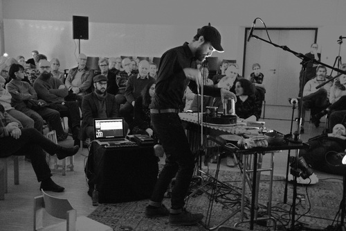 Während Bode sich mit Block­flöten, Lautsprecher und Akustik­hilfen zurück­nimmt, zeigt Gordoa schon einmal die Bandbreite seines Könnens. Da wird ins Marim­bafon geblasen, Handsäge und Geigen­bogen kommen ebenso zum Einsatz wie elektro­nische Hilfs­mittel. Aber auch seine Fertig­keiten mit vier Schlegeln auf den Blättern des Schlag­in­stru­ments verdeut­lichen: Hier ist ein Profi am Werk, der mit viel Fantasie Geräusche erzeugt, die man im Verständnis der Neuen Musik als respek­tables Ergebnis verbuchen kann.