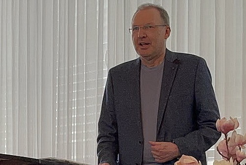 Thomas Jesatko, geboren in Nürnberg und ehema­liger Stipendiat des hiesigen Richard-Wagner-Verbandes, schaut vorbei. Jesatko studierte in seiner Heimat­stadt und in München Gesang. Seit 1997 ist er fest am Natio­nal­theater Mannheim engagiert und hat dort fast alle Wagner-Partien seines Fachs gesungen. In Bayreuth war er als Biterolf und Klingsor zu erleben, zuletzt hatte er als Gast bei der Nürnberger Premiere Die Frau ohne Schatten von Richard Strauss in der Partie des Barak begeistert, O‑Ton berichtete. An diesem Nachmittag präsen­tiert er die beiden großen Lieder des Wolfram von Eschenbach aus Wagners Tannhäuser, eine Partie, die Jesatko bisher auf der Bühne noch nicht gesungen hat. Er beginnt mit Blick ich umher in diesem edlen Kreise aus dem zweiten Aufzug, das er sehr lyrisch und gefühlvoll inter­pre­tiert. Wolframs berückendes Lied an den Abend­stern aus dem dritten Aufzug des Tannhäuser Wie Todes­ahnung, Dämm’rung deckt die Lande – O du mein holder Abend­stern gelingt ihm noch inniger, noch intimer, ohne die Dramatik, die in diesem Lied steckt, zu vernach­läs­sigen. Es ist ein unter die Haut gehender gesang­licher Vortrag, gefühlvoll am Flügel begleitet von der Pianistin Nelli Lipkina, und eine Veredlung des ohnehin sich schon auf höchstem Niveau bewegenden Vortrages von Peter Gülke.