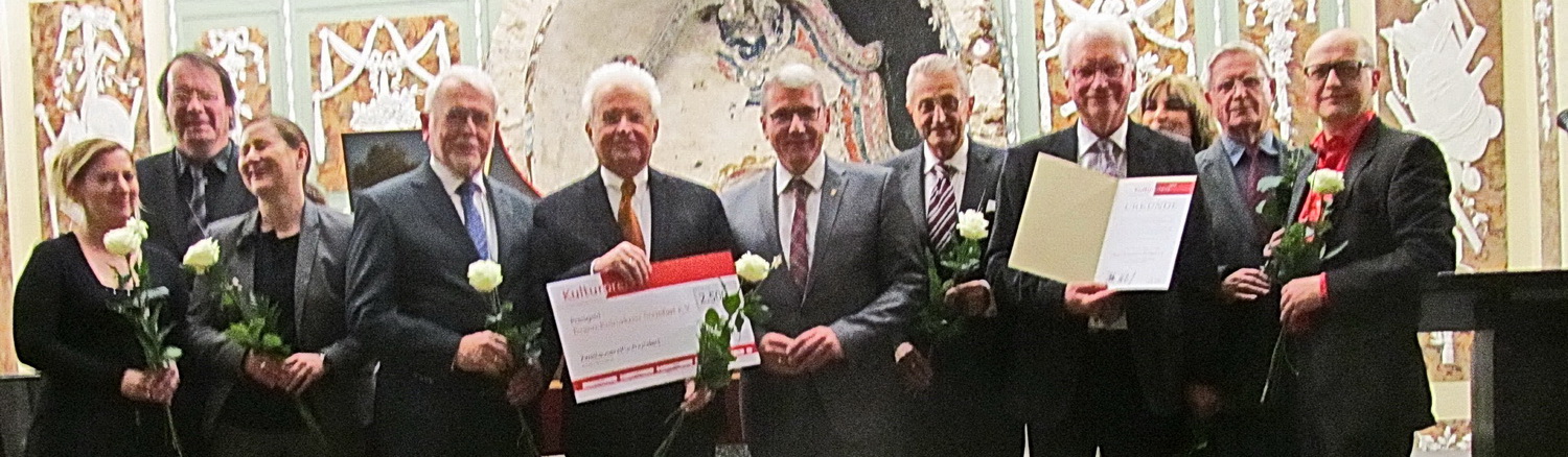 In den Grußworten des Stellvertretenden Bürgermeisters Klaus Meiers und Landrats Klaus Effing werden immer wieder die Vorstandsmitglieder Josef Schwermann, ehemaliger Leiter der Musikschule, Jürgen Holtz von der Sparkasse und Heinz Balster vom Verkehrsverein Steinfurt gewürdigt, Urgesteine des Bagno-Kulturkreises Steinfurt. Mit ihnen sind wichtige Schaltstellen der lokalen und regionalen Politik an Bord und sorgen für das erforderliche Netzwerk. Effing ist es eine besondere Freude, diesem Kulturverein nun den Kulturpreis des Kreises Steinfurt für seine Arbeit zu überreichen, mit der er „maßgeblich zur Bereicherung des Kulturlebens im Kreis Steinfurt“ beigetragen hat. Ein symbolischer Scheck über das bescheidene Preisgeld von 2.500 Euro gehört dazu.