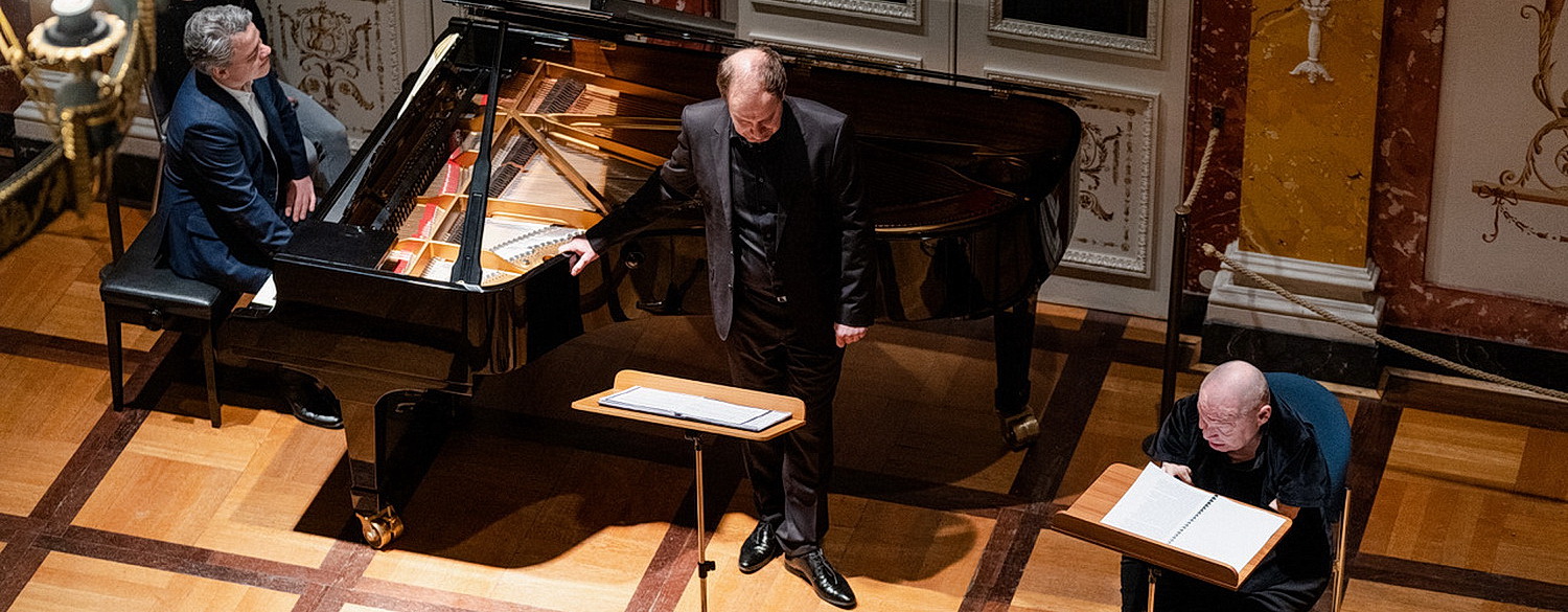 Die schöne Magelone ist nicht gerade ein Zyklus, der häufig aufgeführt wird. Deshalb ist es umso schöner, mit den Mitwirkenden des Abends im Toscanasaal der Residenz Würzburg, Tobias Berndt, Thomas Quasthoff und Alexander Fleischer in diese Geschichte eintauchen zu dürfen. Sprecher Quasthoff erzählt die Geschichte von dem Ritter Peter und der Tochter des Königs von Neapel, der schönen Magelone. Beide verlieben sich bei einem Turnier ineinander, und schon bald sind sie in die unwahrscheinlichsten Begebenheiten verstrickt. Stürme im Äußeren und im Innern der Gefühlswelt begleiten die Wege der beiden bis hin zum glücklichen Ende. Ludwig Tieck hat diese alte Sage modernisiert und in seinen Volksmärchen veröffentlicht. Brahms schuf daraus seinen einzigen Liederzyklus aus einzelnen Romanzen, die die Gefühlszustände der Protagonisten widerspiegeln. Die Künstler haben sich 15 Lieder daraus ausgesucht. Die Begleitung am Klavier ist wahrhaft orchestral, und Fleischer interpretiert das durch und durch dramatische Geschehen intensiv und mit großem Ausdruck. Besonders beeindruckend ist das bei Verzweiflung, als Peter mit einem Boot auf die stürmische See hinaus getrieben wird und seine Geliebte am Ufer lassen muss. Fleischer schafft die Klangteppiche für die Erzählung, ist Peters Laute, breitet Dämmerung aus, lässt es dunkel werden, lässt Tränen tropfen – viel wird geweint in dieser Geschichte. Und in dem Lied Sind es Schmerzen hört man trotz der traurigen Harmonien im Klavier schon, dass die Liebesgeschichte gut ausgehen wird.