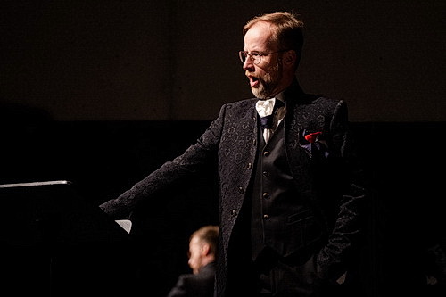 Alexander Fleischer fängt, als einziger am Flügel beleuchtet, mit der Einleitung von Johannes Brahms‘ Guten Abend, gut Nacht an, Mirella Hagen und Peter Schöne singen aus dem Off eine kleine, umgedichtete Begrüßung für die Zuhörer. Danach folgt das angekün­digte Programm, Schöne singt Hanns Eislers Wenn die Igel in der Abend­stunde, Hagen Hugo Wolf und Richard Strauss mit Gesängen zur Nacht. Schöne besitzt einen kraft­vollen, fokus­sierten Bariton und gestaltet intensiv. Die etwas trockene Akustik der Theater­halle am Dom lässt jede noch so kleine Eigenheit hören, da hatten es andere in anderen Räumlich­keiten beim Festival leichter. Bei Schöne hat man den Eindruck, dass er die Töne auch bei Strauss gerne von unten angeht. Hagen wirkt am Beginn etwas zaghaft, taut aber später auf. Die Abend­stunden der Rockband Silly und ihrer Frontfrau Tamara Danz leitet Schöne an der Violine ein, um dann mit dem Text einzu­setzen. Die Lieder des zwanzigsten Jahrhun­derts scheinen ihm zu liegen, hier passt auch das Schleifen, das teils parlie­rende Singen sehr gut, was sich auch später in Reimanns Liedern zeigt.