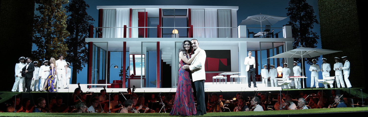 Zurück in die nüchterne Adriatic Arena führt die zweite Wieder­auf­nahme der Festspiele. 2002 schuf der für seine ästhe­ti­schen, modern designten Insze­nie­rungen berühmte Per Luigi Pizzi eine Fassung des Melod­ramma giocoso La Pietra di Paragone. Der Prüfstein oder treffender übersetzt die Liebes­probe ist in einem reichen Dorf auf dem anmutigen Anwesen des Grafen Asdrubale angesiedelt. Pier Luigi Pizzi, der Regie, Bühnenbild und Kostüme gestaltet, lädt den Zuschauer in den Garten einer modernen Villa mit großen Glasfenstern, Terrasse und Swimmingpool ein. Alles ist blendend weiß gestaltet, eine wahrhafte Hollywood-Filmku­lisse, vor der die Handlung frisch lebendig und mit viel Bewegung abläuft.