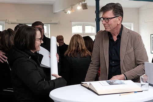 Ausstellungen im Kunstraum Hilden im Gewerbepark-Süd werden von einem Rahmenprogramm begleitet. Sehr beliebt ist dabei das Format Kunstcafé, das Kuratorin Sandra Abend dazu nutzt, ein interessiertes Publikum mit Hintergrundinformationen oder Anekdoten mit Gästen zu versorgen. Zu Gast ist Ansgar Maria van Treeck.