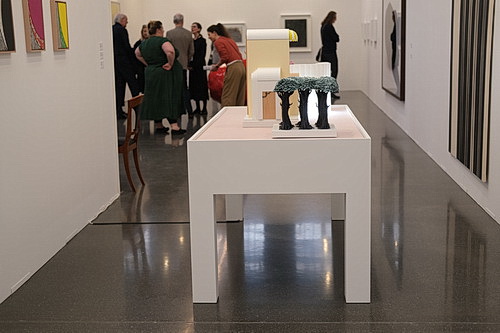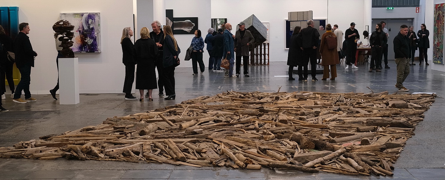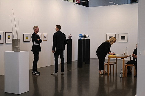 Die Vorschau-Veranstaltung ist recht gut besucht. Statt der vielbeschworenen Diskurse über Kunst gibt es hier wohl eher Wiedersehensfreude alter Bekannter. Es gibt auch wenig zu diskutieren, denn Themen wie Gesellschaft, Politik oder gar Soziales gehören naturgemäß nicht bevorzugt zum Angebot. Wenn Gehlen überhaupt Trends erkennen will, sieht er sie in einem Hang zu Textil, Keramik und Foto – ein Eindruck, der sich während des Rundgangs nicht bestätigen lassen will. Es ist eher der bunte Marktplatz mit vielen verschiedenen Impressionen. Und eigentlich ist das ja für eine Messe auch gar kein Manko. Was da schon eher stört, ist, dass es wenige Objekte gibt, bei denen das Auge mal aufleuchtet.