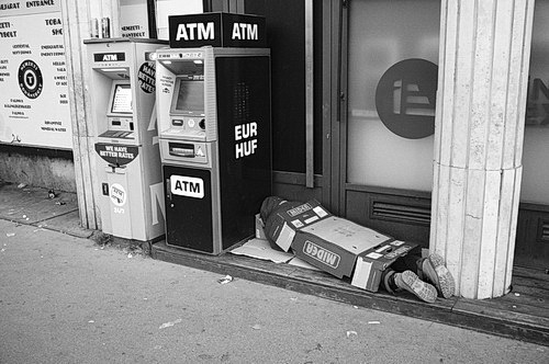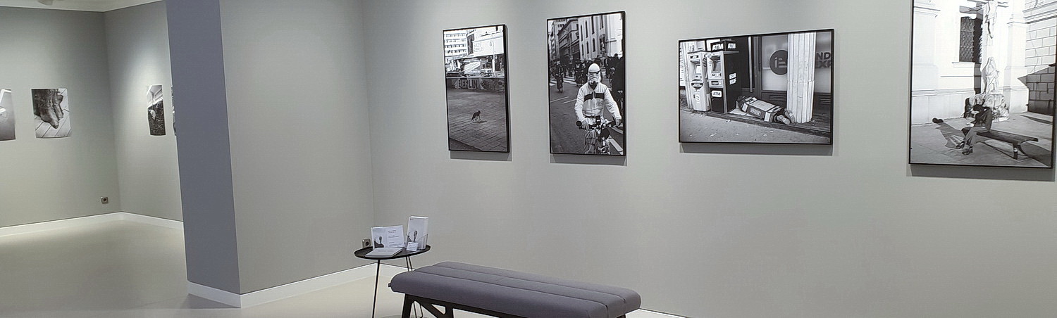 Ein großes Diskussionsthema ist sowohl bei Hobby- als auch bei Profi-Fotografen im Bereich der Straßenfotografie die Abbildung von Menschen. Das hat inzwischen zu einer bedauerlichen Wende zur Silhouetten- und „Rückenfotografie“ geführt, weil die rechtliche Unsicherheit groß ist. Solche Diskussionen braucht Eidinger nicht zu führen, ist doch die künstlerische Abbildung eindeutig geregelt. Wenn er allerdings einen – nicht erkennbaren – Mann unter einem Pappkarton liegend vor zwei Geldauszahlungsautomaten zeigt, wirft das Fragen auf. „Geldautomaten faszinieren mich, weil sie ein Glücksversprechen verkörpern. Der Mann ist dem Reichtum sehr nah. Ihn trennt nur die Geheimzahl“, erklärt der Künstler. „Er wirkt entmenschlicht, wie eine Mensch-Maschine“, sagt er noch. Ist das noch ein würdevolles Abbild des Mannes? Denn das ist doch ein viel entscheidenderes Moment bei der Aufnahme. Ist die Würde des Menschen zugunsten der Kunstfreiheit doch antastbar? Auch bei dem Bild, bei dem sich ein offenbar Erwachsener in einen Kinderwagen zurückzieht, fragt man sich, ob hier nicht jemand in die Privatsphäre eines anderen Menschen eingebrochen ist. Und andererseits: Braucht es nicht gerade viel mehr solcher Fotos, um auf die soziale Wirklichkeit der Gegenwart künstlerisch hinzuweisen? Werke, die viel Anlass zu Gesprächen liefern.