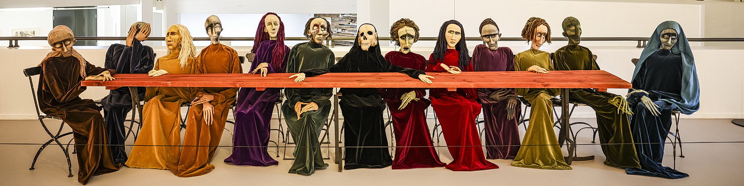In der Duisburger Ausstellung beeindrucken Aepplis plastische Objekte als Gruppe, die aus Einzelfiguren zusammengesetzt sind. Sitzend auf Stühlen oder im Raum stehend, wie ihre monumentalste, epochale, ergreifend präsente Installation Groupe de 48. Lebensgroße Figuren, in schwarze, samtene Gewänder gehüllt, dominieren kraftvoll einen Platz im Raum.