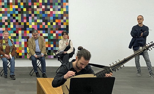 Als Ensemble mit der Bach-Kantate BWW 42 Verleih uns Frieden gnädiglich eröffnet, vereinzeln sich die Musiker in ausgewählte Ausstellungsräume. Während die Posaune von Rocco Rescigno mit Tre Pezzi von Scelsi aus einem Raum tönt, sondieren in anderen mit Out of Space von Alan Fabian die Kontrabassisten Francesco Savignano und Christof Weinig die Dialogfähigkeiten von Bild und Klang. Jakob Wagners warmtönige Erzlaute, eine italienische Barocklaute, mischt die Toccata VI von Johann H. Kapsberger mit Syrinx von Claude Debussy. Von Oberlingers Spiel mit einer körpergroßen Subbass-Blockflöte geht eine besondere Faszination von einem selten zu sehenden und zu hörenden Instrument sowie von ihrer Interpretation aus.