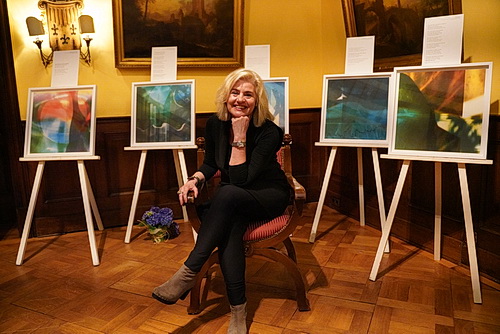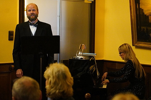 Daran beteiligt ist die Künst­lerin Friederike Näscher. Sie stammt aus einer Düssel­dorfer Künst­ler­fa­milie, hat an der Folkwang-Univer­sität der Künste in Essen Kommu­ni­ka­ti­ons­design studiert. Nach dem Studium arbeitete sie als künst­le­rische Leiterin für inter­na­tionale Verlage und Agenturen, ehe sie eine eigene Design­agentur gründete. Seit 2010 lehrt sie außerdem als Hochschul­do­zentin visuelle Kommu­ni­kation. Ihre Spezia­lität sind Fotogramme. Vierzehn dieser Werke hat sie als „Heine-Zyklus“ unter dem Titel Meer und Himmel hör ich singen zusam­men­ge­fasst. Die stehen jetzt auf Staffeln im hinteren Teil des Raums, denn an den Wänden hängen bereits großfor­matige Ölschinken. Vor dem Kamin ist eine Leinwand aufge­hängt. Rechts davon sind ein Rednerpult und ein Klavier aufgebaut. Der Clou des Abends: Näscher hat den einzelnen Bildern Texte von Heinrich Heine zugeordnet, die nun, da der Raum bis auf den aller­letzten Platz besetzt ist, entweder von ihr selbst gesprochen – oder gesungen werden, so weit Robert Schumann sie vertont hat. Dazu hat Lausberg den Bariton James Martin einge­laden. Geboren ist er in Brisbane, Australien; er studierte an der Guildhall School of Music and Drama in London und an der Staat­lichen Hochschule für Musik in Mannheim. Seither tritt er freischaffend an Opern­bühnen und auf Festivals auf. Sein eher hell getönter, enorm kraft­voller Bariton ist präde­sti­niert für die Textver­ständ­lichkeit und den oft lyrischen Klang von Liedern, denen er sich in zahlreichen Konzerten widmet. Begleitet wird er heute Abend von Meghan Behiel. Die gebürtige Kanadierin studierte in ihrer Heimat­stadt Calgary, später an der Univer­sität der Künste in Bern, lebt seit vielen Jahren in Deutschland und verfügt über ein unglaub­liches Reper­toire in der Klavierbegleitung.