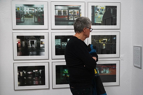 Und wenn Schülke dann wieder zurück ist in Eller, wundert er sich. Dann geht er bei Einbruch der Dunkelheit durch die Straßen und fotografiert die von innen erleuchteten Geschäfte, Supermärkte, Waschgaragen im Stadtteil. Nachtbilder, die zu den verstörendsten Exponaten dieser hochverdichteten, qualitätvollen Ausstellung gehören. Alles dreht sich um. Wird fremd. Hopper-Stimmung in Eller. Da stirbt man schneller, sagt der Volksmund. Und Künstler wie Gerolf Schülke begrüßt derselbe Volksmund auf der Straße mit einem aufgeräumten „Hallo, Picasso!“