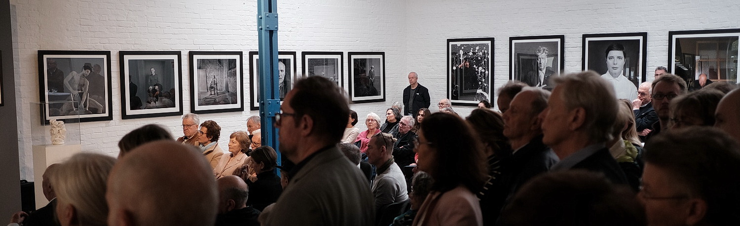 Und damit schließt sich der Kreis zum Kunstraum im Gewerbepark Süd. Hier lässt sich Dannenmann im vollbesetzten Haus feiern. Mike Rafalczyk und Uwe Rössler vom Ensemble Die Syncopators begeistern mit musikalischen Einlagen, Liedern von Komponisten wie Rudi Schurike, Peter Igelhoff oder Peter Kreuder, die ausgesprochen gute Laune verbreiten. Der Erklärung Rafalczyks, man habe auf Du hast den Farbfilm vergessen, mein Michael von Nina Hagen verzichtet, weil es zu plakativ gewesen sei, mag man nur mit leichtem Bedauern folgen. Aber auf jeden Fall unterstreichen die beiden Musiker den musealen Charakter der Ausstellung. Aktuell ist das Spiel mit den Geschlechtern, das hier nicht mit ideologischer Verbissenheit, sondern mit künstlerischer Lust präsentiert wird. Was die vielgerühmten Schwarzweiß-Porträts angeht, die mit einer Mittelformat-Kamera analog aufgenommen sind, erinnern sie an längst vergangene Zeiten, glanzvolle Zeiten allerdings, weil Dannenmann einen einfühlsamen Blick auf sein Gegenüber beweist, der oft unter die Haut – des Künstlers – geht. Als der Fotograf auf die Idee kam, auch farbige Fotografien zu zeigen, brachte er Abend vorübergehend in Gewissensnöte. Farbfotos auf geweißten Backsteinwänden – da sträubte sich alles in ihr. Wie sie den Wunsch bei der Hängung mit einfachen Mitteln gekonnt umsetzte, können sich Besucher der Ausstellung noch bis zum 2. Juni ansehen.
