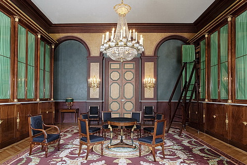 Weiblicher, leichter und wieder von exquisitem Geschmack ist der danebengelegene Kirsch-Salon, der seinen Namen der Farbtönung von Wandbespannung, Sesselbezügen und Vorhängen verdankt. Bemerkenswert der kunstvoll mit bunten Marmor-Einlagen dekorierte Kamin des italienischen Steinschneiders Francesco Belloni.