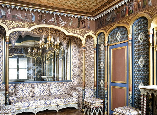 Last, but not least ist für Historiker und Kunsthistoriker das Badkabinett und das angrenzende türkische Boudoir von besonderem Interesse. Denn es ist selten, dass so private Orte in alten Palästen erhalten geblieben sind, außerdem ist gerade hier die künstlerische Ausgestaltung besonders reizvoll und bis ins kleinste Detail ausgearbeitet. In beiden Räumen findet man antik-römische als auch orientalische Einflüsse. Wenn im Badekabinett der Plafond der Domus Aurea in Rom nachempfunden ist, so läuft im Boudoir ein auf Pompeji-Rot gemalter Fries oben an den Wänden entlang, der das Leben einer jungen Frau vom Hause ihres Vaters bis zum Harem des Paschas schildert.