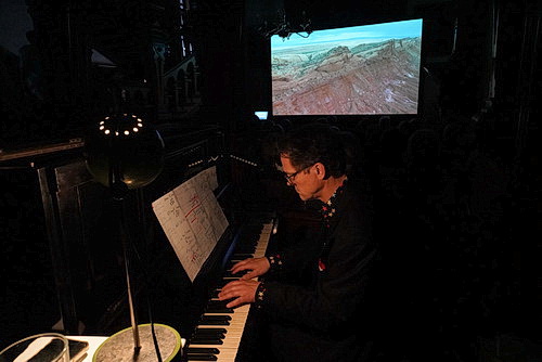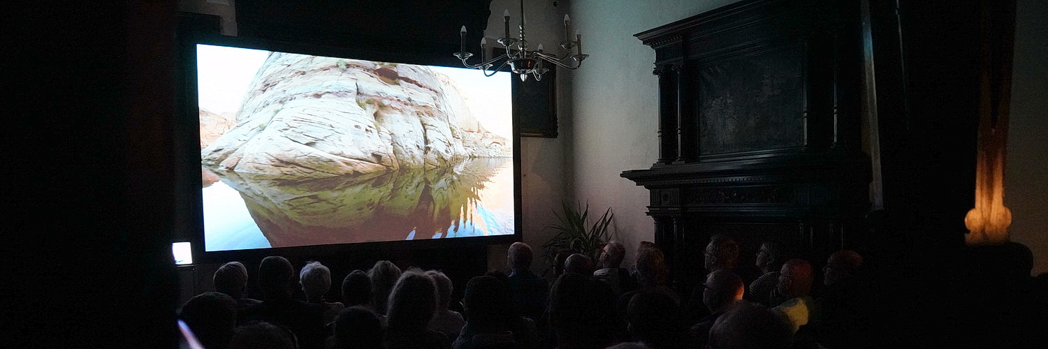 Ulrike Arnold studierte in Düsseldorf Musik und Kunsterziehung. Als Künstlerin lebt sie heute in Düsseldorf und in Flagstaff im nordamerikanischen Arizona. Ihre Spezialität ist, aus Erden, Mineralien und Steinen Malmaterial herzustellen, das sie auf Nesselstoff aufträgt. Während sie ihre Materialien auf den Böden verschiedener Kontinente einsammelt, schickt ihr Lebensgefährte, der Fotograf Victor van Keuren, Drohnen in die Luft, um einzigartige Bilder einzufangen. Zur Eröffnung haben sich Arnold und Lausberg einen Videoabend einfallen lassen. Sie stellen van Keurens Film Dos Desiertos – auf Deutsch zwei Wüsten – vor. Ein Stummfilm in Farbe, der Drohnenflüge über den Wüsten des Colorado Plateaus im südwestlichen Nordamerika und dem Altiplano, eine Hochebene in Südost-Peru und West-Bolivien zwischen den Hochgebirgsketten der West- und Ost-Anden, zeigt. Musikalisch unterlegt werden die Bilder mit Improvisationen des Düsseldorfer Pianisten Markus Goosmann, der als einer der wenigen Stummfilmpianisten der Gegenwart gilt. Van Keuren präsentiert fantastische Bilder, die einerseits die Faszination der Wüste vermitteln, sich viel häufiger durch Weglassen eines Horizonts aber auf Bodenstrukturen konzentrieren, so dass bizarre Texturen in den Vordergrund treten. Goosmann beweist viel Feingefühl für den Rhythmus der Bilder und spielt eine farbenreiche Musik, die von meditativen Klängen über nachklingende Einzeltöne, die wie Tropfen ins Bild fallen bis in jazzige Anflüge reicht, die abrupt innehalten, ehe sie sich zu Melodien entwickeln können.