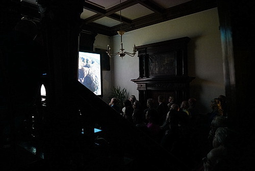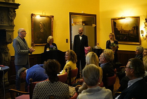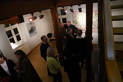 Es muss nicht immer die Galerie sein, um Kunstwerke zu präsentieren. Galerist Bernd Lausberg hat sich etwas Besonderes einfallen lassen, um die neueste Arbeit von Friederike Näscher zu zeigen. Der Erfolg spricht für sich. Der Saal ist bis auf den letzten Platz besetzt, und nach dem offiziellen Teil denkt hier lange keiner der Besucher daran, nach Hause zu gehen.